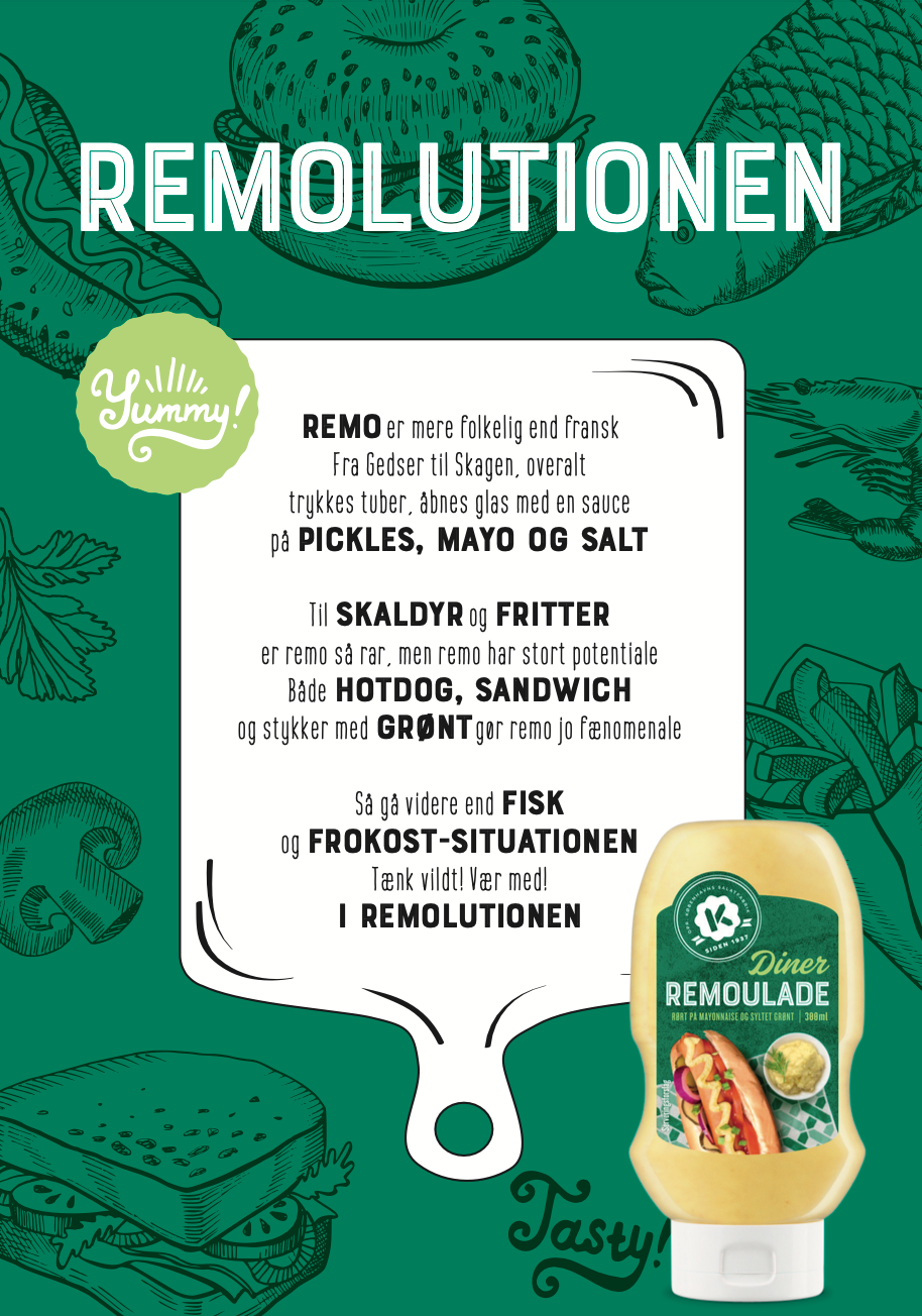 K salat havde lidt penge tilbage i budgettet. Og ville gerne fortælle shopperne, at remo kunne bruges til andet end fiskefilet. Det projekt endte med en lille digtsamling om kondimenter, du gratis kunne plukke ved køledisken. Her "Remolutionen" fra side 2.